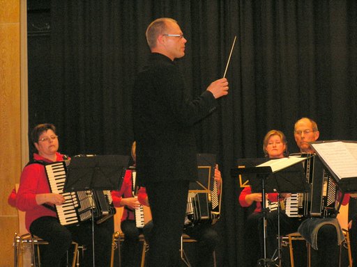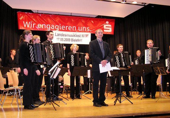 10. DHV-Landesmusikfest NRW am 17. Mai 09 in Bielefeld Das 10. DHV-Landesmusikfest NRW für Akkordeonorchester und Ensembles wurde in diesem Jahr vom DHV-Bezirk Ostwestfalen-Lippe am 17. Mai 2009 im Schulzentrum Bielefeld-Brackwede durchgeführt. Ausrichter war das Akkordeon-Studio-Orchester Bielefeld unter der Gesamtleitung von Helmut Quakernack. 21 Orchester und 4 Ensembles hatten hier die Chance, nach monatelanger Probenarbeit, einer fachkundigen Jury (Prof. Jürgen Löchter, Wolfgang Pfeffer, Hans-Günther Kölz, Wolfgang Wagner, Sabine Kölz, Mateja Zenzerovic) ihr Wettbewerbsprogramm vorzustellen. Während der ganztägigen Veranstaltung gab es, in zwei sehr schönen Sälen, in den verschiedensten Kategorien und Altersgruppen sehr viele interessante und unterschiedliche Musikbeiträge zu hören. Um 16.30 Uhr eröffnete das LandesJugendAkkordeonOrchester von NRW unter der Leitung von Helmut Quakernack die Abschlussveranstaltung. Der Saal war mit rund 450 Aktiven bis auf den letzten Platz gefüllt, und alle warteten gespannt auf die Ergebnisse. Aber vorher durften die Orchester und Ensembles noch den überzeugend vorgetragenen Werken des LJAO lauschen. Es spielte u. a. Great Joy", eine Rock-Symphonie von Lars Peter Schultz, Transsylvania", eine feurige Balkansuite von Helmut Quakernack und die Tango Fantasy" von Hans-Günther Kölz. Dann begann die natürlich mit viel Spannung erwartete Preisverleihung. Die Landes-vorsitzende des DHV-NRW, Frau Isolde Alka, übergab den Orchestern/Ensembles, die ein hervorragend" erspielt hatten, ihre wohlverdiente Urkunde samt Goldmedaille. Alle anderen erhielten ebenfalls eine Urkunde plus Silbermedaille. Gewinner in der Höchststufe, und damit Landessieger 2009, wurde das von Bärbel Klott dirigierte 1. Akkordeonorchester Dinslaken 1965 e.V. Bei den Siegern der verschiedenen Kategorien brach natürlich überschäumender Jubel aus, und es wurde bereits im Saal kräftig gesungen und gefeiert. Wie dann die Heimreise verlaufen ist, entzieht sich dem Schreiber dieser Zeilen, aber wer Derartiges bereits kennen gelernt hat, kann es sich bestimmt gut vorstellen. |