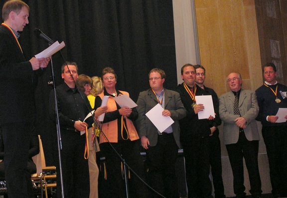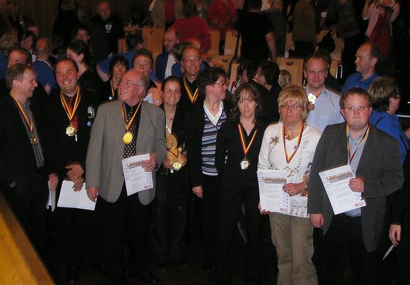 10. DHV-Landesmusikfest NRW am 17. Mai 09 in Bielefeld Das 10. DHV-Landesmusikfest NRW für Akkordeonorchester und Ensembles wurde in diesem Jahr vom DHV-Bezirk Ostwestfalen-Lippe am 17. Mai 2009 im Schulzentrum Bielefeld-Brackwede durchgeführt. Ausrichter war das Akkordeon-Studio-Orchester Bielefeld unter der Gesamtleitung von Helmut Quakernack. 21 Orchester und 4 Ensembles hatten hier die Chance, nach monatelanger Probenarbeit, einer fachkundigen Jury (Prof. Jürgen Löchter, Wolfgang Pfeffer, Hans-Günther Kölz, Wolfgang Wagner, Sabine Kölz, Mateja Zenzerovic) ihr Wettbewerbsprogramm vorzustellen. Während der ganztägigen Veranstaltung gab es, in zwei sehr schönen Sälen, in den verschiedensten Kategorien und Altersgruppen sehr viele interessante und unterschiedliche Musikbeiträge zu hören. Um 16.30 Uhr eröffnete das LandesJugendAkkordeonOrchester von NRW unter der Leitung von Helmut Quakernack die Abschlussveranstaltung. Der Saal war mit rund 450 Aktiven bis auf den letzten Platz gefüllt, und alle warteten gespannt auf die Ergebnisse. Aber vorher durften die Orchester und Ensembles noch den überzeugend vorgetragenen Werken des LJAO lauschen. Es spielte u. a. Great Joy", eine Rock-Symphonie von Lars Peter Schultz, Transsylvania", eine feurige Balkansuite von Helmut Quakernack und die Tango Fantasy" von Hans-Günther Kölz. Dann begann die natürlich mit viel Spannung erwartete Preisverleihung. Die Landes-vorsitzende des DHV-NRW, Frau Isolde Alka, übergab den Orchestern/Ensembles, die ein hervorragend" erspielt hatten, ihre wohlverdiente Urkunde samt Goldmedaille. Alle anderen erhielten ebenfalls eine Urkunde plus Silbermedaille. Gewinner in der Höchststufe, und damit Landessieger 2009, wurde das von Bärbel Klott dirigierte 1. Akkordeonorchester Dinslaken 1965 e.V. Bei den Siegern der verschiedenen Kategorien brach natürlich überschäumender Jubel aus, und es wurde bereits im Saal kräftig gesungen und gefeiert. Wie dann die Heimreise verlaufen ist, entzieht sich dem Schreiber dieser Zeilen, aber wer Derartiges bereits kennen gelernt hat, kann es sich bestimmt gut vorstellen. |